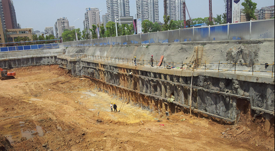 工程特點:項目位于武昌區(qū)武珞路老武鍋內(nèi),設(shè)置二層滿鋪地下室,開挖深度9.70m~15.50m,周長380m,面積8500m2。